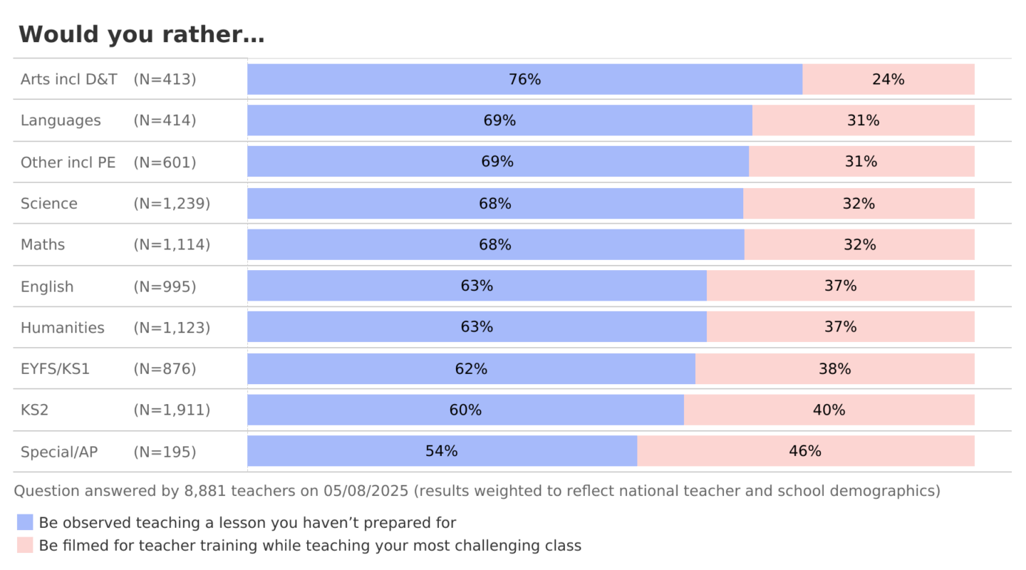 Teachers in special/alternative provision schools are the most confident being filmed with their challenging classes (46%), whereas arts inc design and technology teachers are the most confident they could ‘wing it’ being observed when they haven’t prepared (76%)!