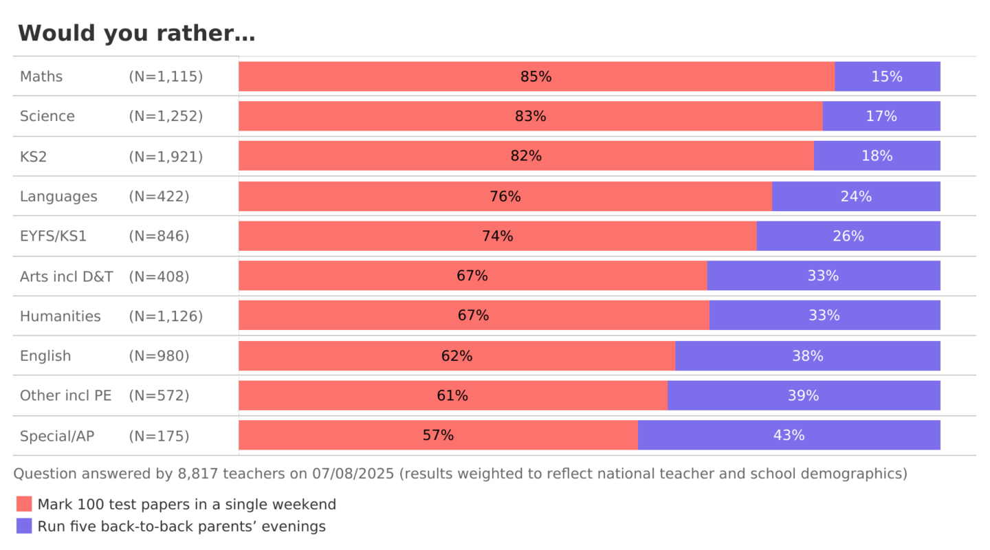 This revealed a HUGE split between subjects. As you might expect, maths, science and KS2 teachers were the most keen to mark papers rather than speak to parents five nights in a row (85%, 83% and 82%), and teachers in special/AP, other inc PE and English teachers were the more likely to want to speak to parents over facing a towering marking pile (38%, 39%, 43%)