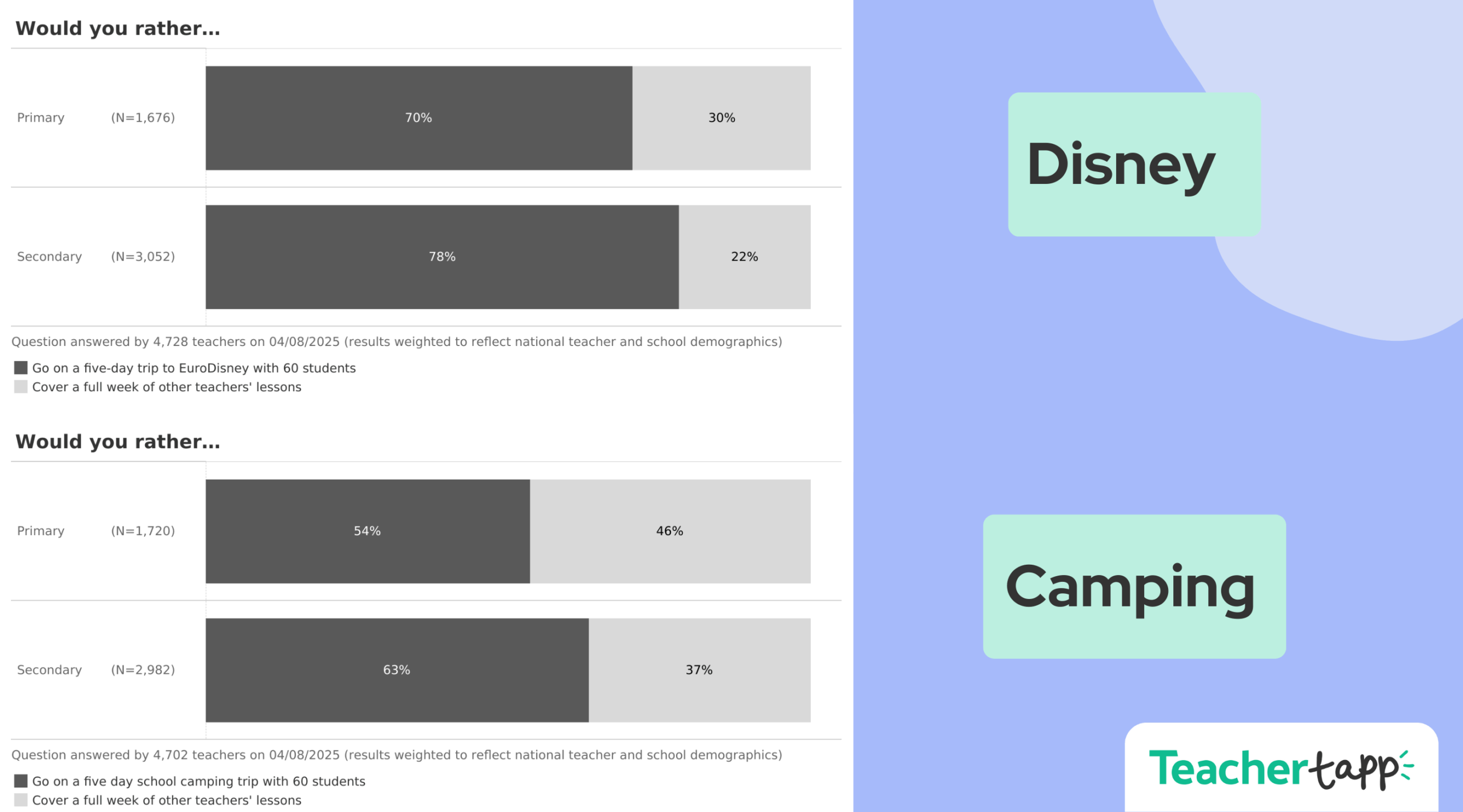 70% of primary and 78% of secondary would pick EuroDisney over covering absent teachers, but just 54% of primary and 63% of secondary would pick camping over cover.