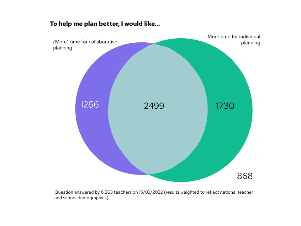 Are all of these individuals the same – are the Venn diagrams of who answered overlapping? Not quite – it turns out! Of the two-thirds of teachers who wanted more individual planning time, just over half of them also wanted more collaborative planning time. In fact, the number of teachers calling for just collaborative planning time alone is small compared to the other numbers!