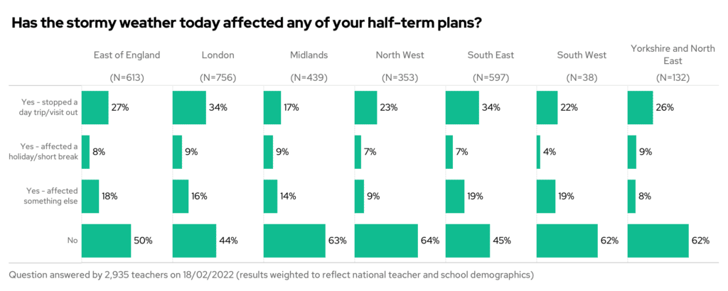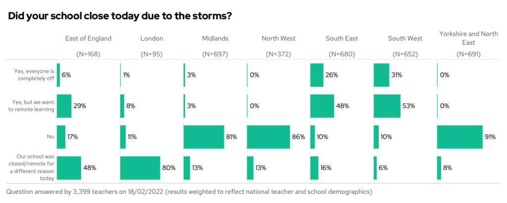 First note: half of schools were on half-term. Don’t worry! We didn’t ask teachers in those schools about the storms. We asked them something else instead that day.