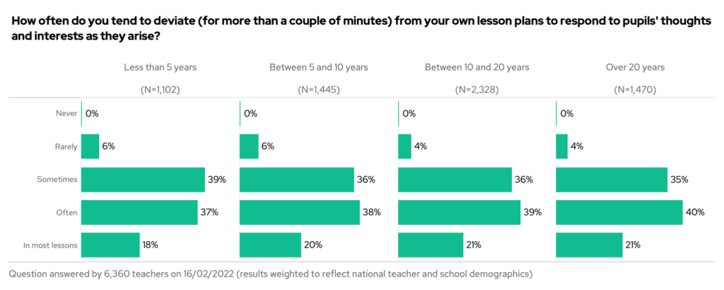 One teacher wondered whether this was more common among more experienced teachers? The answer is, in part, yes – but not by much! Even among teachers with less than 5 years experience, 18% are deviating most lessons and a further 37% not quite as regularly.