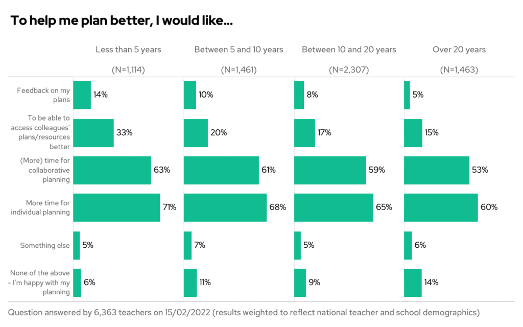 And departments/colleagues take note – a third of the least experienced teachers want better access to their colleagues’ plans and resources. Share, please!