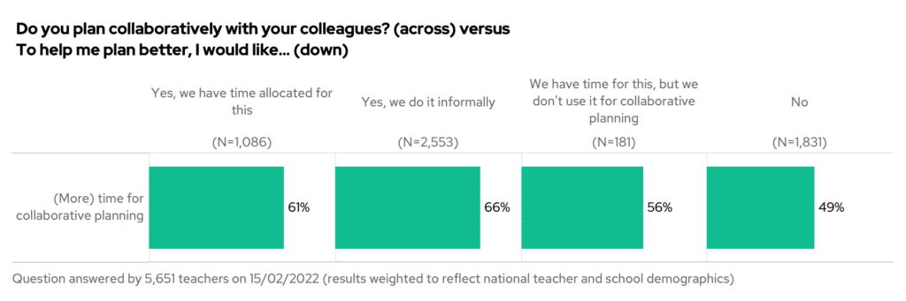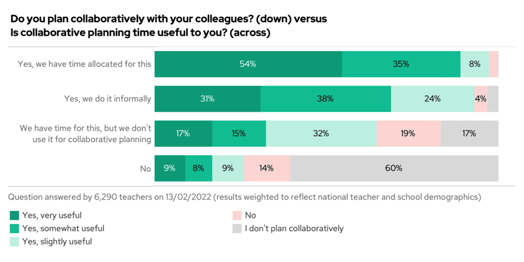 Only one-in-four of you say you have time allocated to plan collaboratively with their colleagues, but if you do have that time, then you’re singing the praises of collaboration! A huge 97% of you who have time allocated to plan collaboratively find it useful.