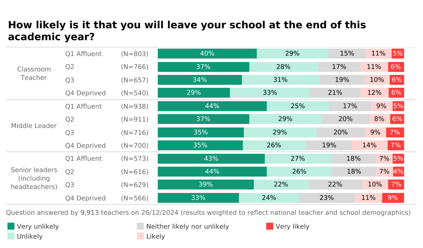 Are some teachers more on the fence about leaving than others? To some extent, yes. Classroom teachers in the most affluent schools are the least likely to want to jump ship, with 40% ‘very unlikely’ to leave compared to just 29% in the most deprived schools.