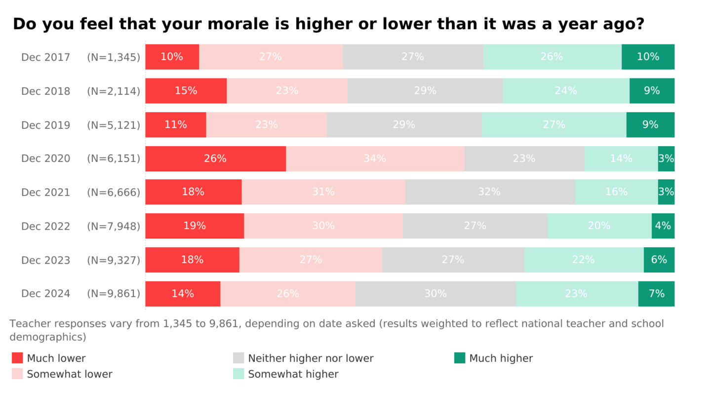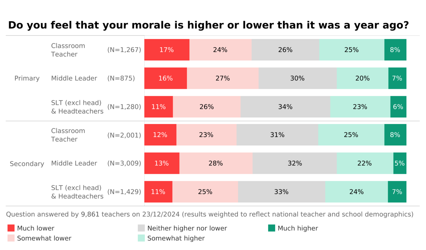 Looking back over time, that year-on-year comparison took a nosedive in December 2020. A massive 26% of teachers felt morale was much lower than in previous years.