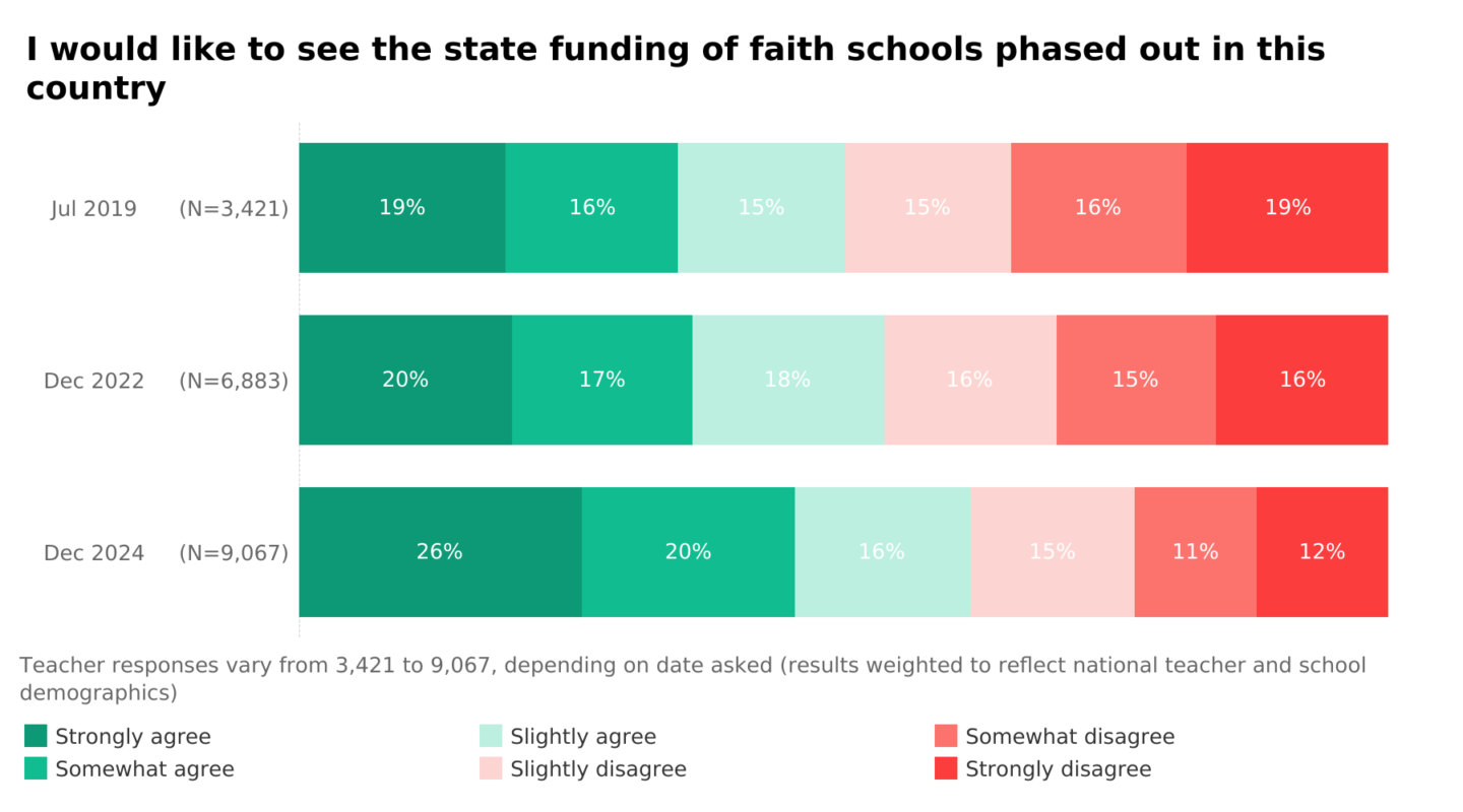 There has been an increase in those who strongly support phasing out faith schools, increasing from 20% ‘strongly agree’ in 2019 to 26% in 2024.