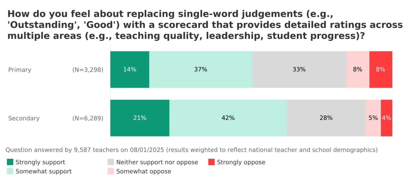 However, there also appears to be reticence towards the scorecards among senior leaders: 10% of senior leaders, including headteachers, ‘strongly oppose’ the change away from single-word judgements, compared to 5% of middle leaders and classroom teachers.