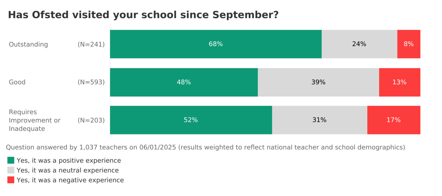 However – these experiences do change when we account for the last Ofsted judgement made about the school. Teachers in schools previously graded ‘Outstanding’ were more likely to say it was positive when compared to teachers in ‘Good’ schools (68% vs 48%) and in ‘Requires Improvement’ schools (68% vs 52%).