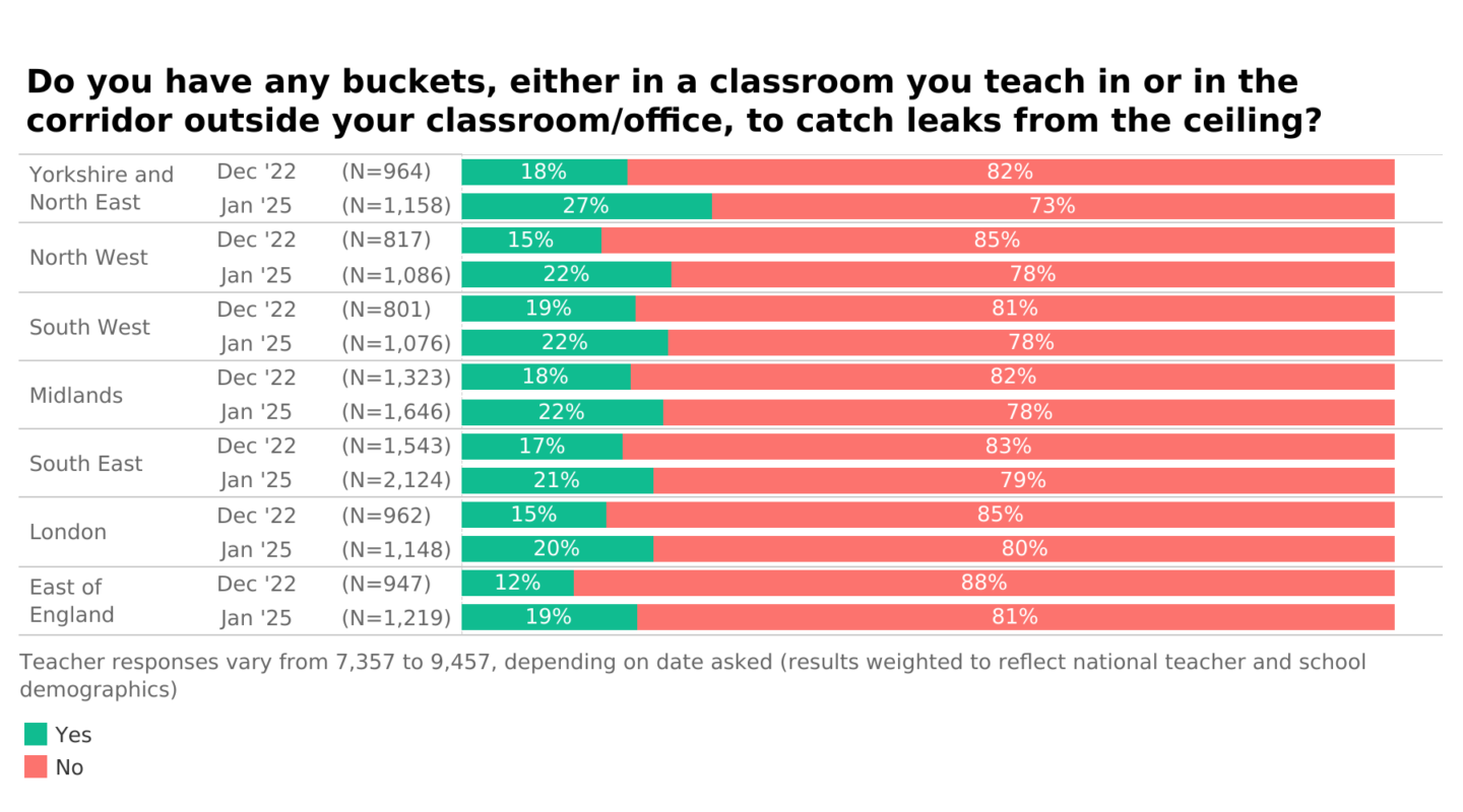 Every region has reported MORE buckets in corridors or classrooms to catch leaks – but it is the North East and Yorkshire where 27% of classrooms have a bucket to catch the leaks, up from 18% in 2022.