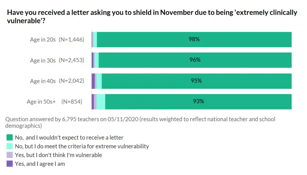 2% of teachers told us they had received a shielding letter, which is roughly in line with the population. The figure was a little higher for older teachers. Of those receiving the letter, only about half agree that they meet the criteria for shielding. Unfortunately the health databases on which these letters are sent are a little crude. However, a further 2% of teachers who did not receive the letter feel that they nevertheless meet the criteria for extremely clinically vulnerable. This was particularly true of older teachers.