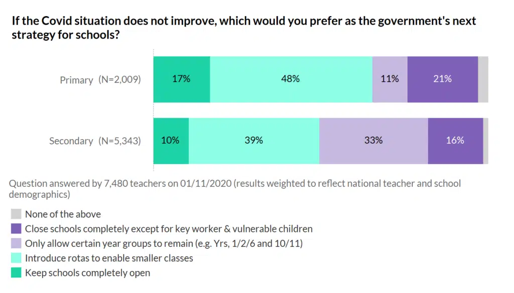 What is clear is that, if the situation deteriorates, few want to return to the situation during last lockdown where the vast majority of children accessed no face-to-face schooling. Primary teachers tend to favour introducing rotas so that every child can come to school part-time. Secondary teachers are more split, with a third favouring prioritisation of certain year groups (i.e. the exam ones) over others.