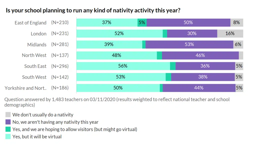 Sadly, our luck has run out this year. Around half of schools are not going to run a nativity at all 😞(purple) , while the other half are going virtual 💻(bright green). Almost no one is even holding out hope of having visitors (the dark green sliver). Still, at least it means that teachers don’t have to battle to get out of work to go to their own child’s play. You can quietly stream it under the desk instead… Shh, we never suggested that!