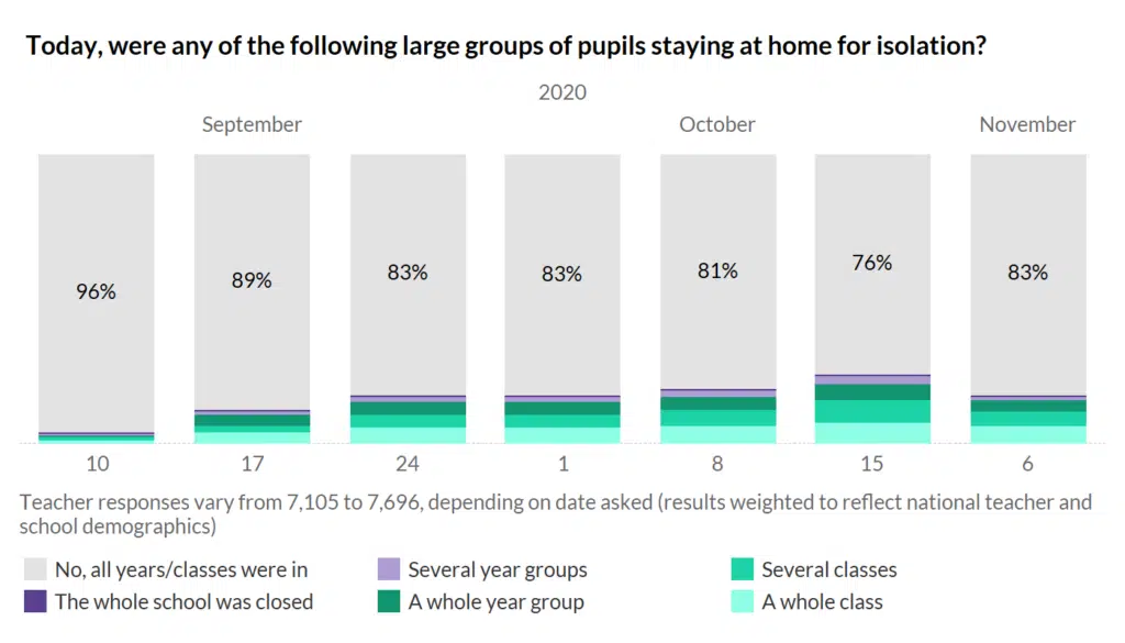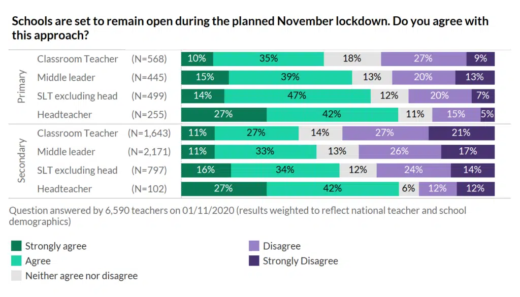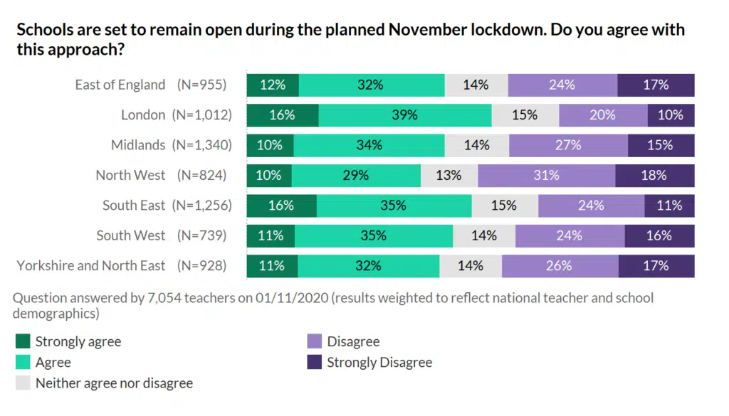 Keeping schools and childcare open during lockdown is controversial. According to ONS statistics, about 40% of UK households have dependent children living in them, which means reducing transmissions rate during this second lockdown will be challenging. But, overall, more teachers (47%) want to see schools remain open than want to see them closed (39%).