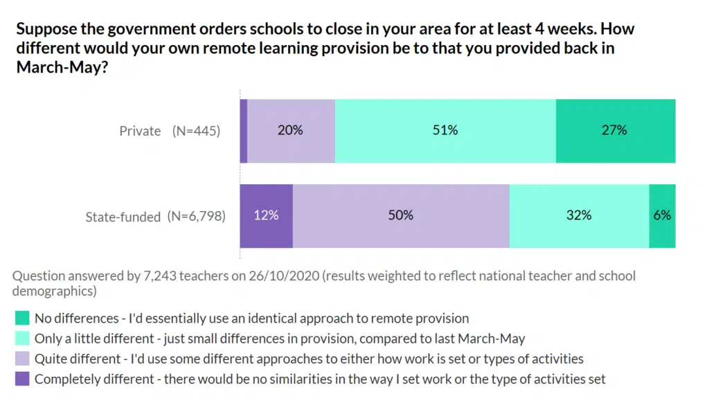 In the private sector, where remote lessons happened reasonably quickly, things would mostly be the same. In the state sector, however, the majority of teachers said things would either be completely different (12%) or quite different (50%). Given that every school is now providing work for isolated students, most are much better equipped for emailing/texting/phoning and providing work online.
