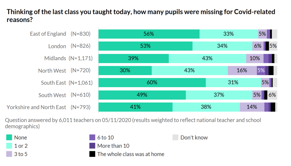 Looking at the data we can see that most schools managed to open to most pupils last week. But there is a clear regional difference reflecting the current prevalence of COVID across the country.