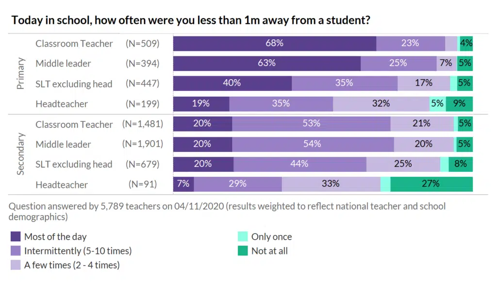 Not surprising, then, that almost 7 in 10 primary classroom teachers said they had spent ‘most of the day’ less than 1m away from a student. In secondary schools, just 2 in 10 teachers said the same.