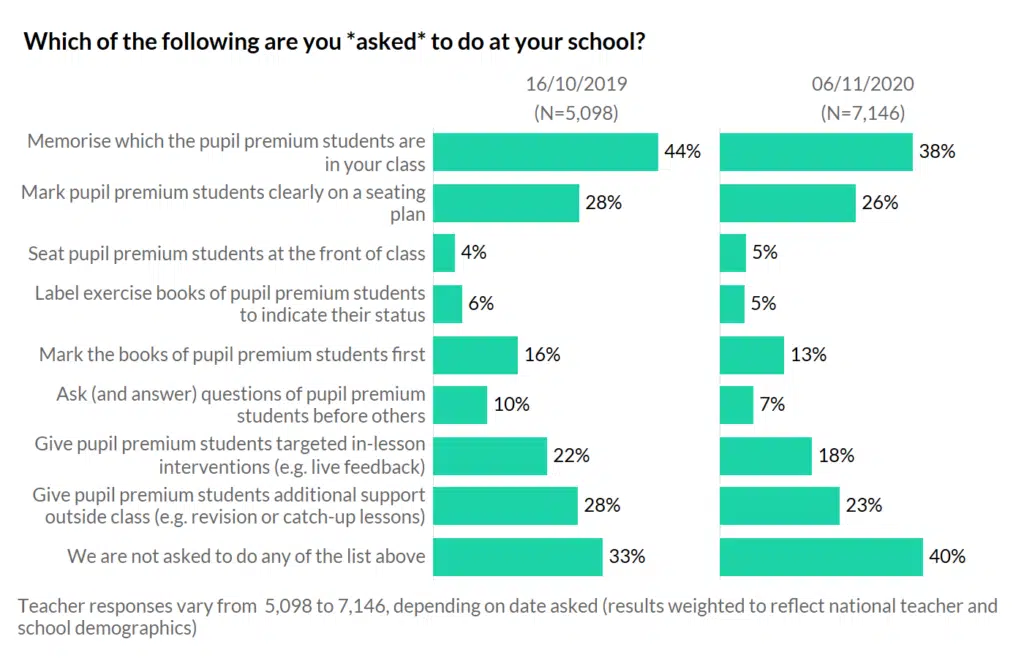 First, the pupil premium label. Last year we asked if your school required you to take certain actions for pupil premium pupils. This year we can see there is a slightly reduction in most activity – for example, fewer teachers are being asked to memorise who their pupil premium students are, or give targeted interventions. The shifts aren’t huge, but they are consistent. Is this because Ofsted inspections are currently off?