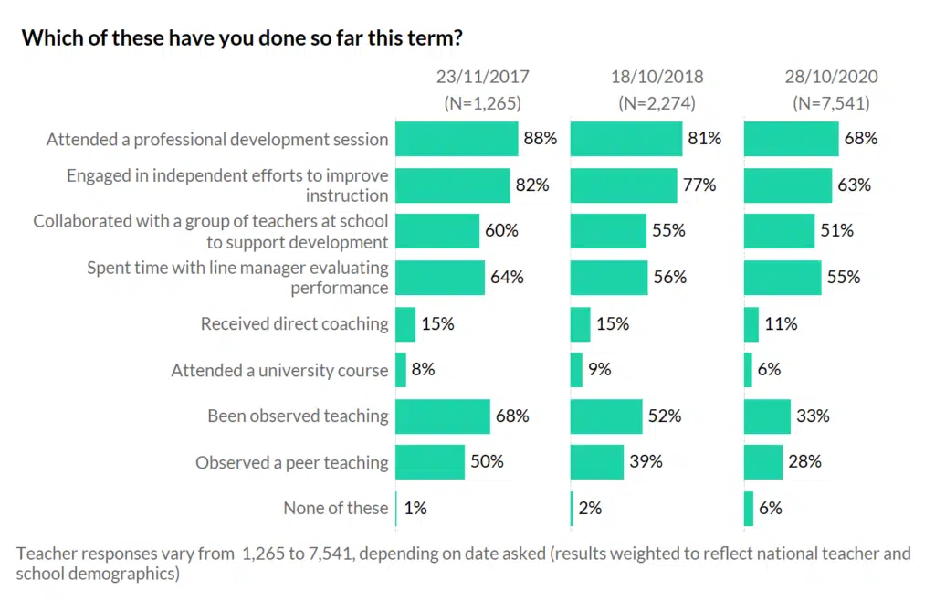 Teacher professional development has also taken a hit – with many fewer teachers attending training sessions, being observed teaching or seeing a peer teaching. (Again, quite difficult to do with social distancing).