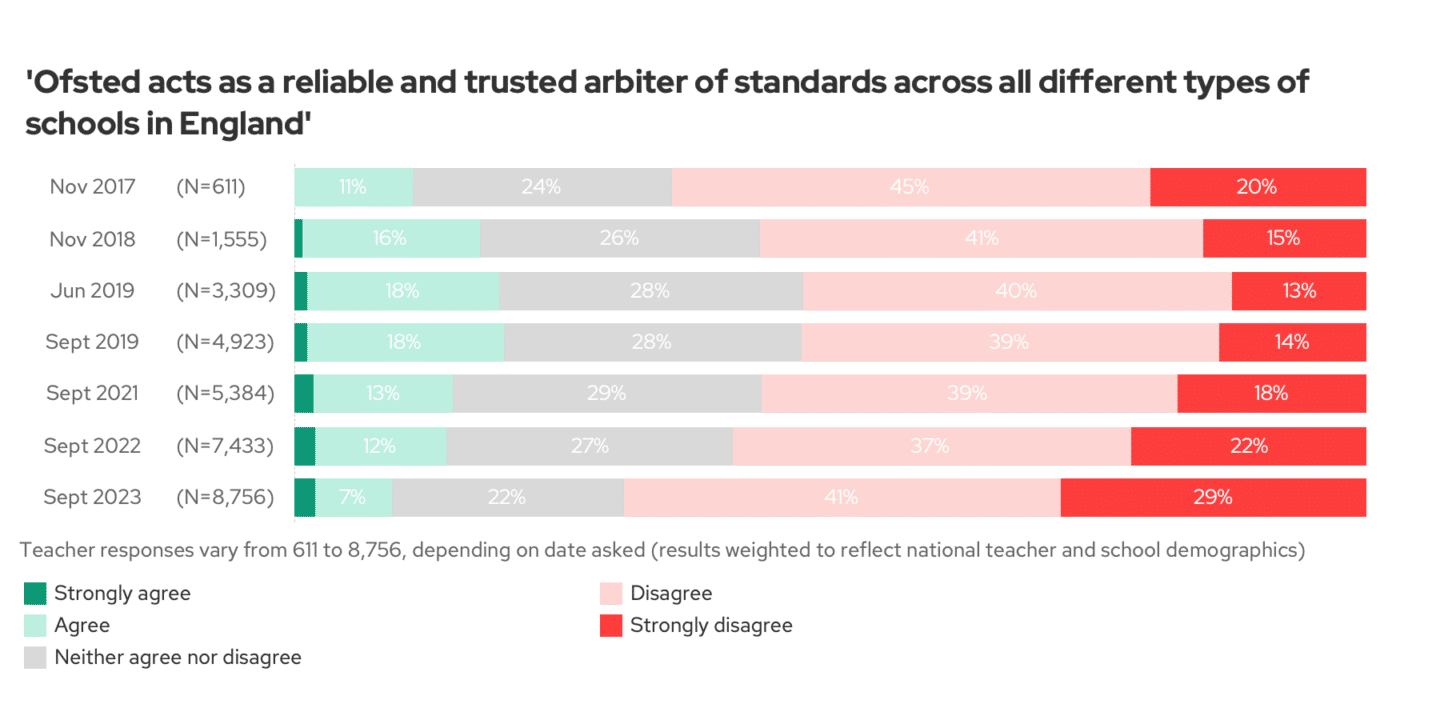 📈 The proportion of teachers who ‘strongly disagree’ that Ofsted is a realiable and trusted arbiter of standards. Ofsted is in its worst position on this question since we started asking back in 2017 (the year Amanda Spielman took over from Sir Michael Wilshaw). Time for a change perhaps?