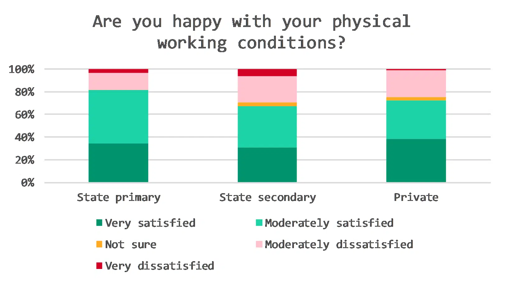 But secondary schools could do with a boost. Around a third of secondary teachers (30%) were dissatisfied with their physical conditions.