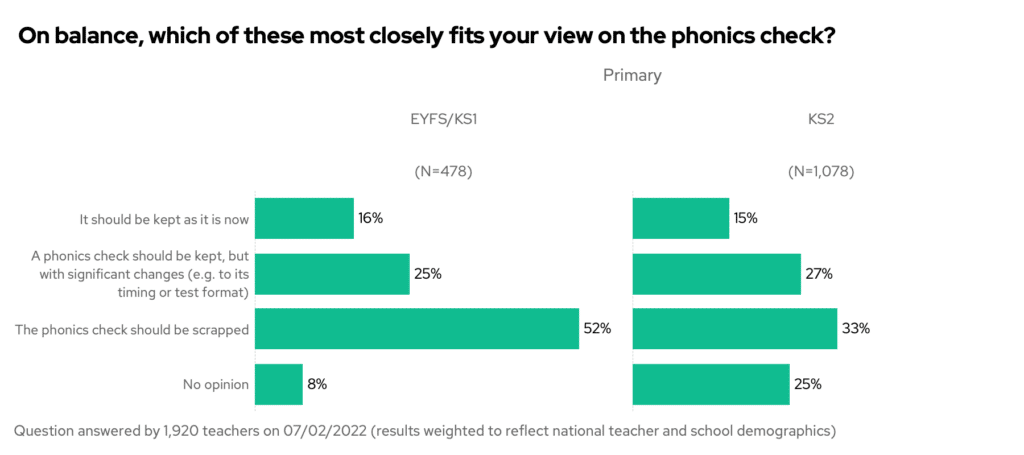 All things considered, over half of KS1 teachers think that the phonics check should be scrapped. A further 25% of KS1 teachers want at least significant changes to the check.