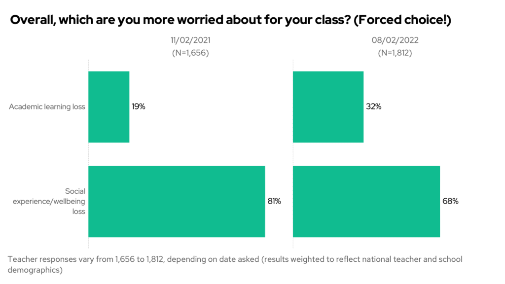 Now, a year later, it’s down to 68%. And academic learning loss has increasingly crept into minds, with a third of primary teachers now more worried about this for their class.