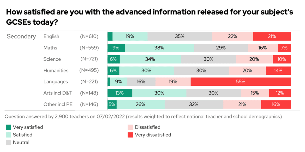 Languages teachers were the most dissatisfied: a whopping 55% were very dissatisfied with their advanced information with a further 19% simply being dissatisfied. Language teachers – what about this information left you wanting more? (Usual tweets to @TeacherTapp or messages via contact us in the app are most welcome).