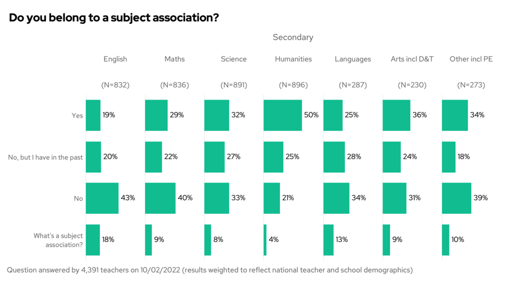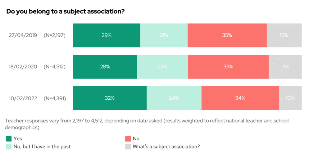 When we last asked this question in the pre-pandemic era, 28% of you said you belonged to an association – two years later this is now 32%. Has the pandemic caused teachers to seek out people other than those in their department to further their knowledge of the subject?