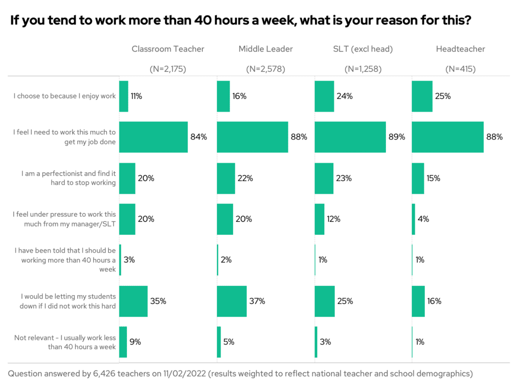 One-in-five classroom teachers reported feeling pressure from their manager or the senior leadership team to work so long – despite only 3% being told they had to.
