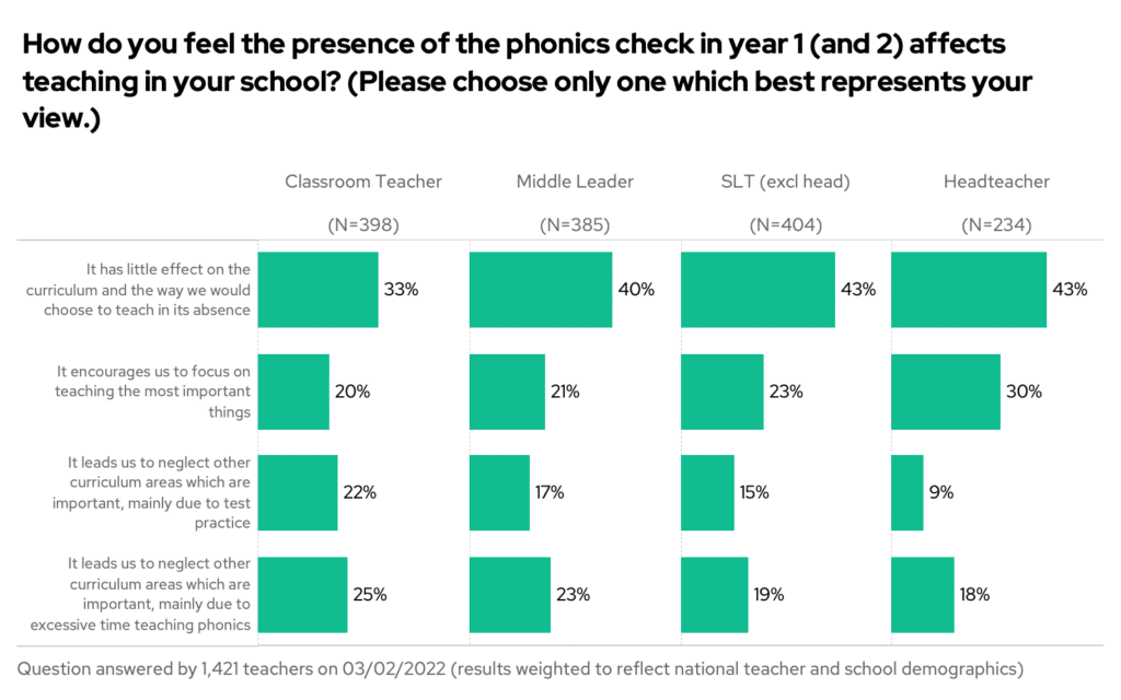On the other hand, 25% of primary classroom teachers believe that teaching phonics does neglect other areas of the curriculum.