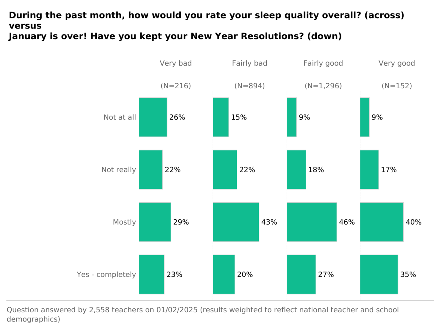 To find out if Teacher Tappers were experiencing similar patterns, we asked about sleep, and New Year Resolutions…and discovered those who slept better were more likely to have kept their New Year Resolutions.