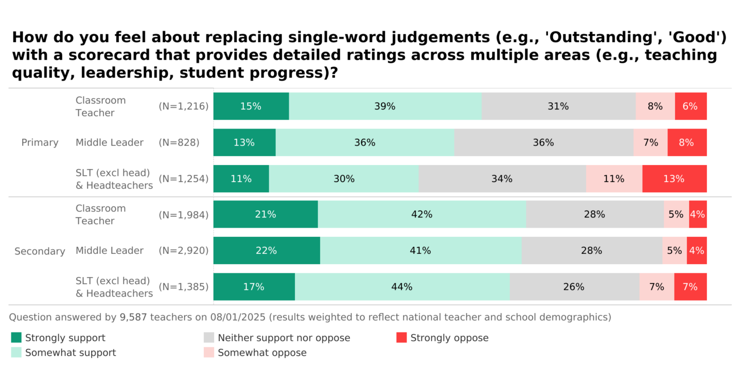 When previously asked, support for the new approach varied between primary and secondary phases. More secondary classroom teachers ‘strongly support’ the new plans compared to primary (15% vs 21%), and more secondary SLT (including headteachers) ‘strongly support’ the plans compared to primary (17% vs 11%).