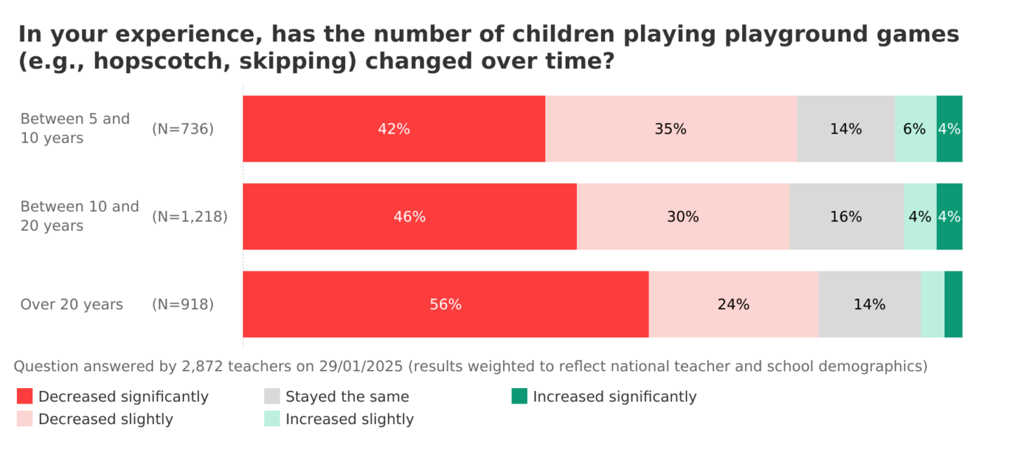 “Lack of funding to provide playground games. Children don’t know how to play—no experience ‘playing out’ after school. Schools can’t afford to replace broken equipment, lunchtime staff are stretched, and there’s no budget to train them to lead games.”