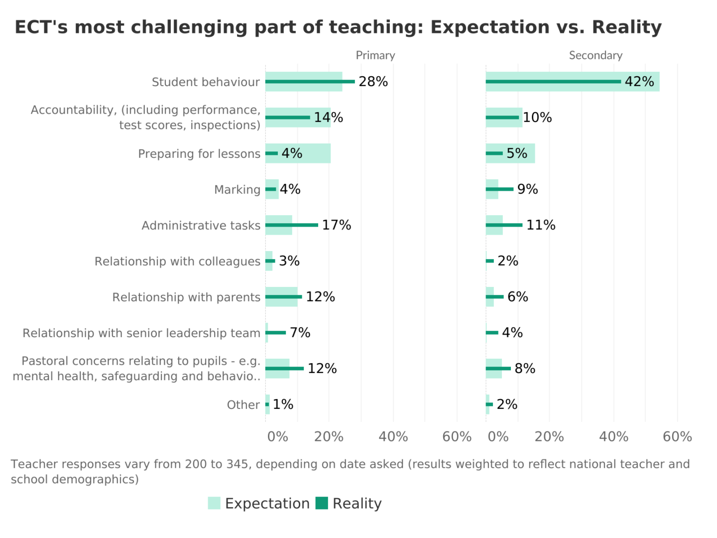 But now the ECT has started, there was a small increase in primary teachers finding behaviour the biggest challenge (28% UP four percentage points) and a small decrease in secondary (42% DOWN 12 percentage points).