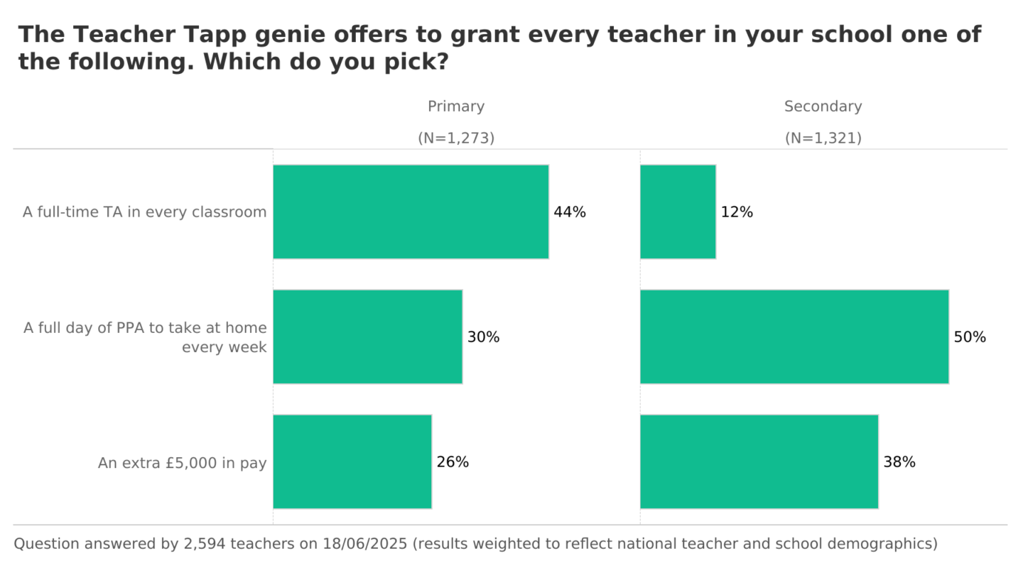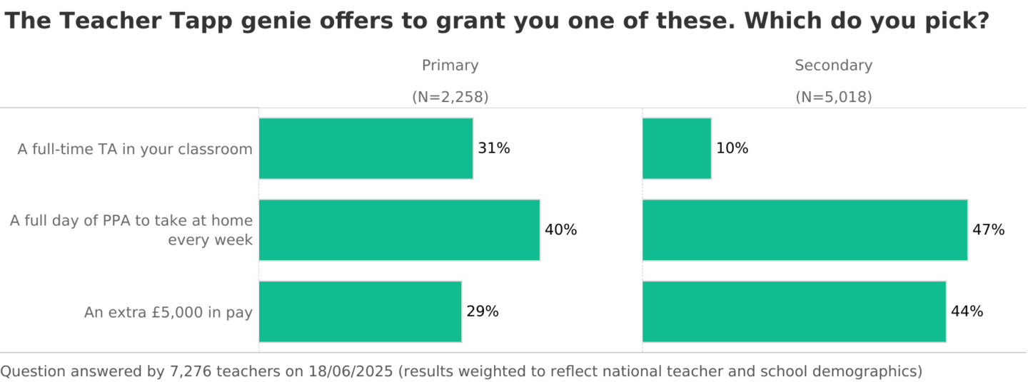 In secondary – yes, they did! The top three choices matched the secondary picks exactly. But in primary? Leaders picked the TA…but teachers were more likely to pick a full day of PPA at home.