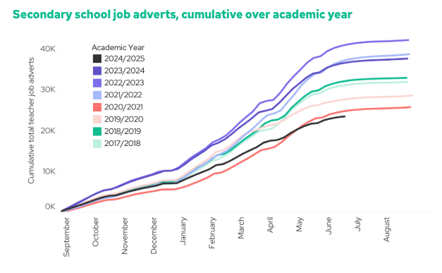Secondary teacher job adverts are down 27% compared to 2018/19, and a whopping 36% down on last year.