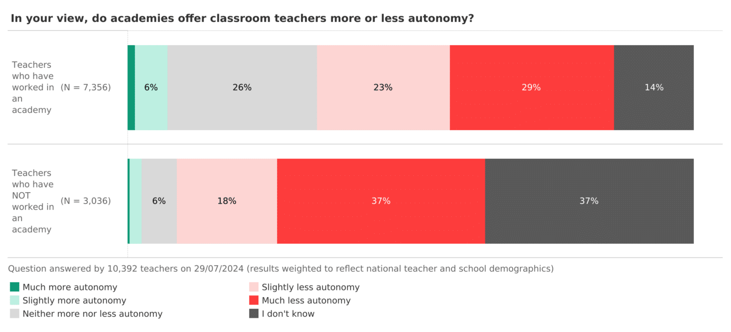 Teachers who have worked in an academy are more likely to say academies offer neither more nor less autonomy or more autonomy compared to teachers who have not worked in an academy (33% vs 8%).