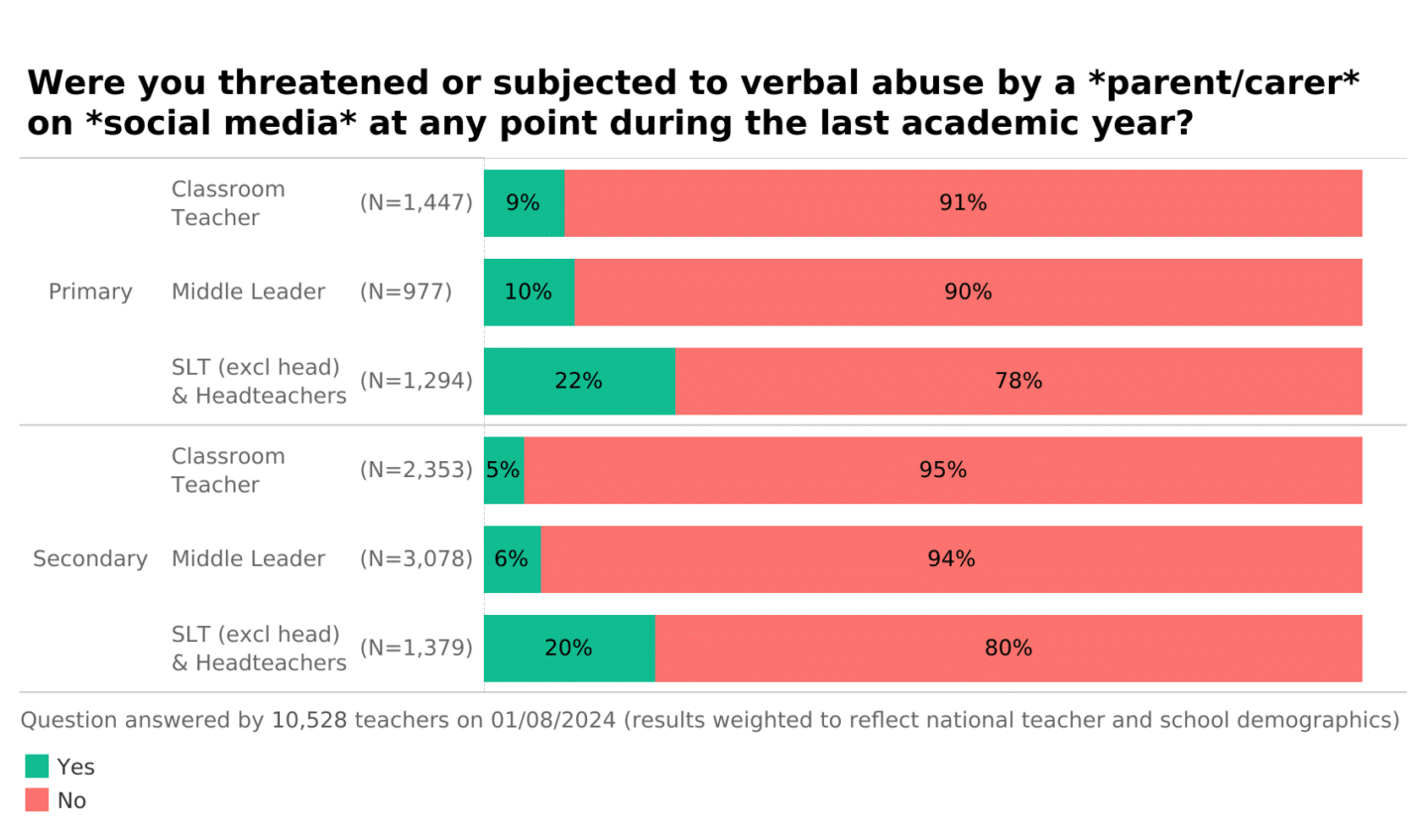 However, it is senior leaders who are most likely to be targeted: 22% of senior leaders in primary and 20% of senior leaders in secondary have had online abuse last year.
