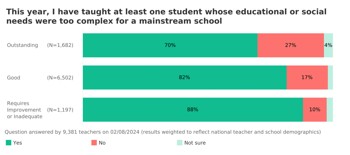Teachers working in Ofsted graded RI or inadequate schools are more likely to say they have taught a child this year whose needs were too complex for a mainstream school (88% vs 82% and 70%).