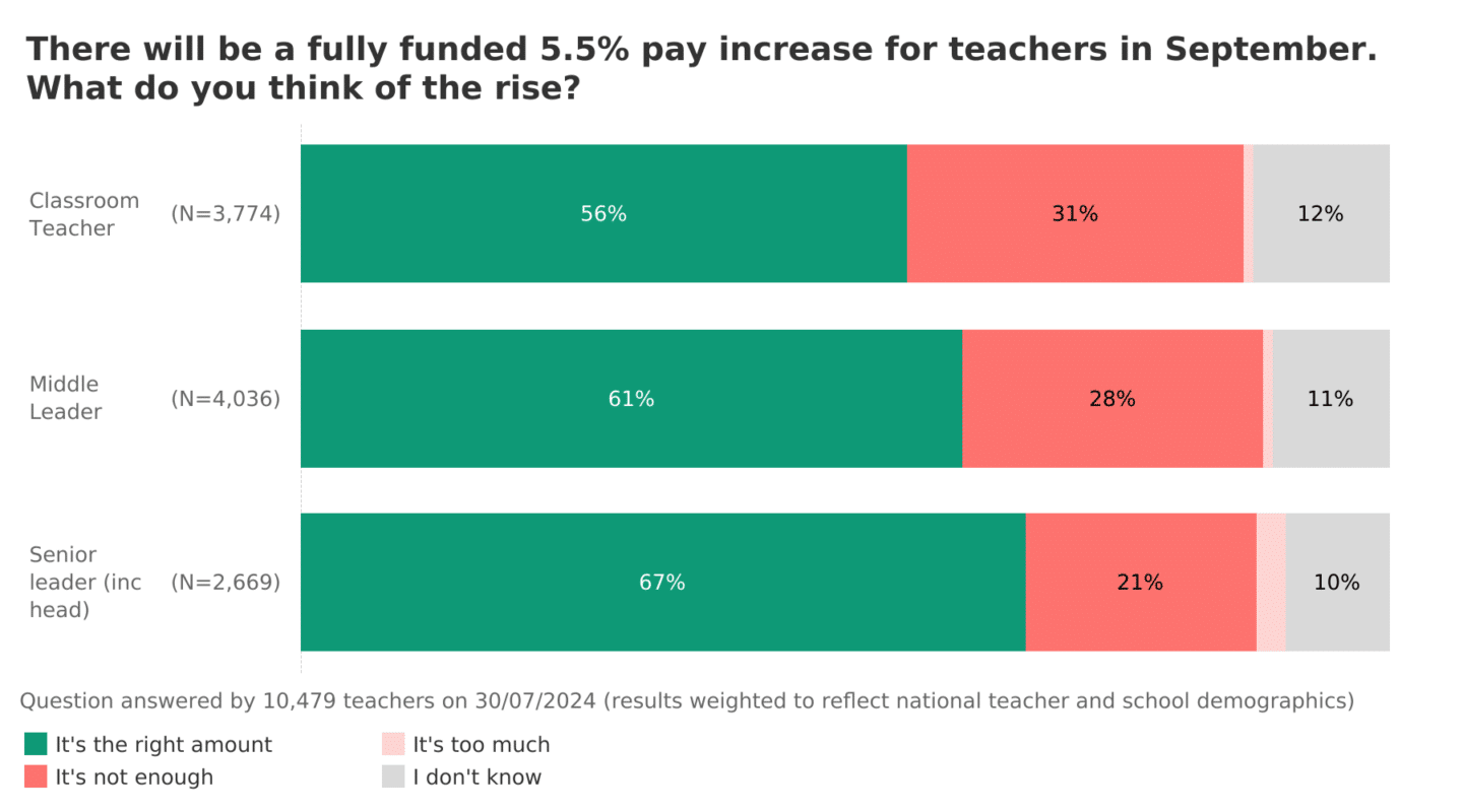 More senior leaders thought the increase was too much compared to classroom or middle leaders (3% vs 1%). This could be because senior leaders have the headache of balancing school budgets, and ensuring the money is there to pay the higher wages.
