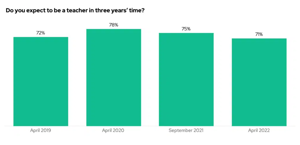 A natural question is whether the pandemic has changed teachers’ intentions to remain within teaching. Teacher Tappers are regularly asked whether they expect to be a teacher in three years’ time. The pandemic saw a rise in the percentage of teachers who do expect to be a teacher in three years, likely because teaching provided some security during the uncertainty. In 2022, however, the figure has returned to 2019 levels. That said, it is no worse than levels recorded pre-pandemic.
