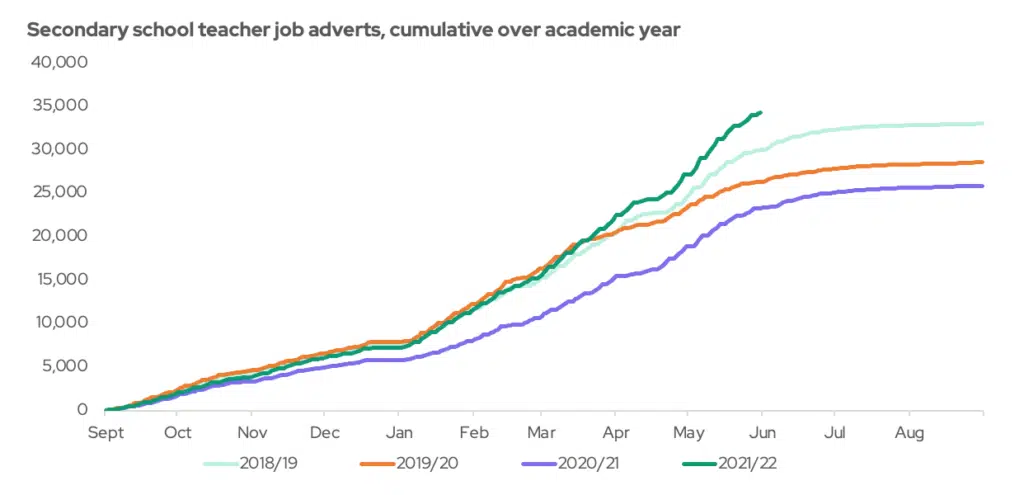 Our report shows that the teacher labour market appears to have recovered from the pandemic. In the pandemic years of 2019/20 and 2020/21, there ended up being far fewer job advertisements in secondary schools than the previous academic year. This year, however, the picture is much changed. The number of job adverts is now booming – they are up 47% on last year and up 14% on 2018/19, the last pre-pandemic year.