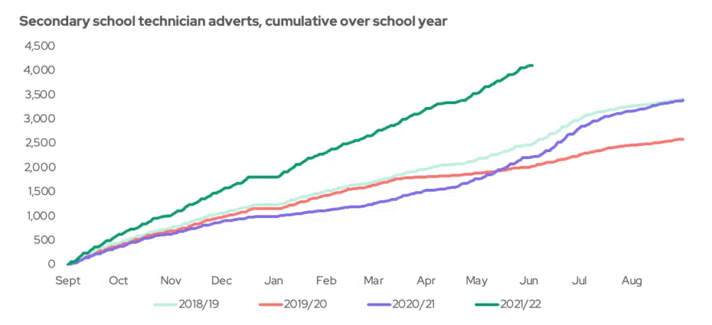 It’s not just teachers that are in high demand. Technicians are also highly sought after. SchoolDash has collected information about the number of adverts for art, science, technology and other technicians posted by secondary schools. Just like teachers, the number of job adverts for technicians sharply fell during the pandemic, although we do not know whether this was due to fewer technicians leaving their jobs or whether schools were making less use of technicians during this period.