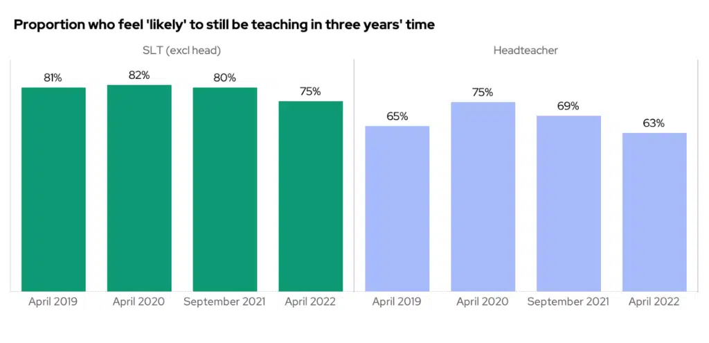 In pre-pandemic years, 65% of heads said they still planned to be in the profession in three years’ time. This rose to 75% of heads during the pandemic for reasons discussed above. However, this year just 63% of heads say they plan to remain in the profession in three years’ time. Of course, many of these will not have sufficiently high pension contributions to retire and not work, and so their resignation will depend on whether they can find suitable employment elsewhere.