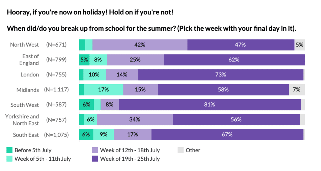 The Midlands stand out as having a slightly different schedule to the rest of the country, with 20% of teachers having broken up even earlier than those in the North West, before the 11th July. Which parts of the Midlands follow this schedule? We’d love to know!