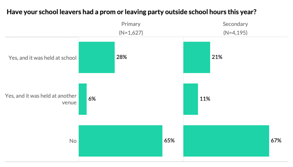 Back in 2019 we asked whether students were having a leaving party, and only 1-in-4 schools didn’t. This year is understandably different. Some 30% are still having a leaving party – either at the school or elsewhere! But that leaves a much bigger group going without this time around.