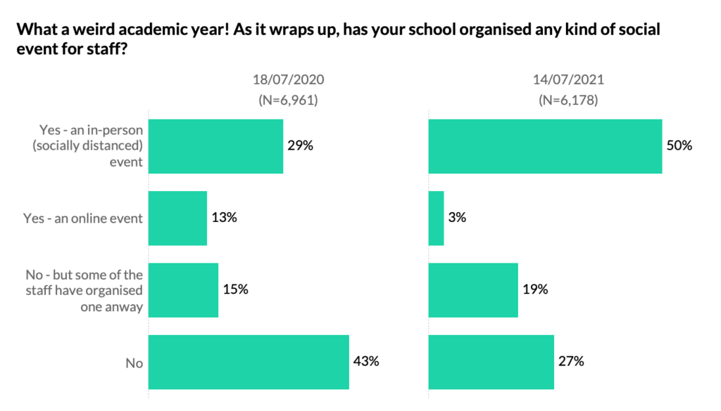 At the end of the last academic year, 43% of teachers didn’t have a social event to wave farewell. The relaxation of restrictions in this academic year means that 3-in-4 teachers are now able to wrap up the year with an event. Kudos to the 19% of teachers who school didn’t organise a social event, but the staff did anyway!