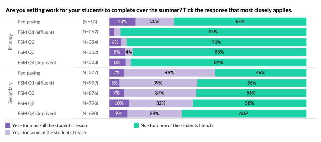 What does homework look like over the summer? Last year, we also asked this question and we’ve spotted a few differences. For example, last year, we found that if students were in either a fee-paying or a school in a more deprived are, then they were more likely to be set work over the summer.
