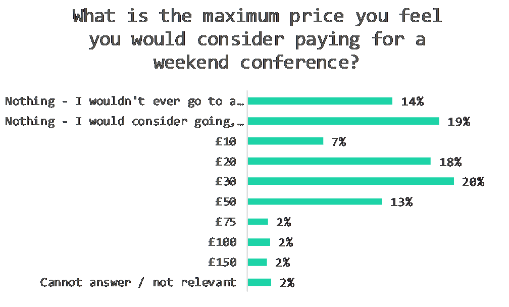 Across the 65% of teachers who would attend a weekend conference and pay for it out of their own pocket, the maximum they would consider paying varied from £10 (7% of panellists) to £150 (clicked by 2% of panellists).